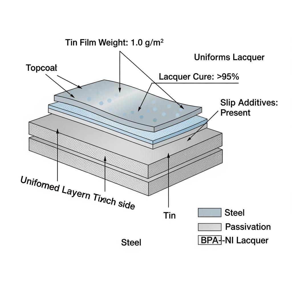 Electrolytic tinplate provides the metallurgical backbone: a low‑carbon steel core plated with tin and passivation layers that resist underfilm corrosion. With BPA‑NI lacquers, corrosion control hinges on lacquer integrity, coverage at seams and cut edges, and compatibility with your product chemistry. Acidic vegetables and tomato‑based products are typically straightforward; higher‑sulfur recipes demand specialized internal coats and careful seam compound choice to avoid black sulfur staining.
