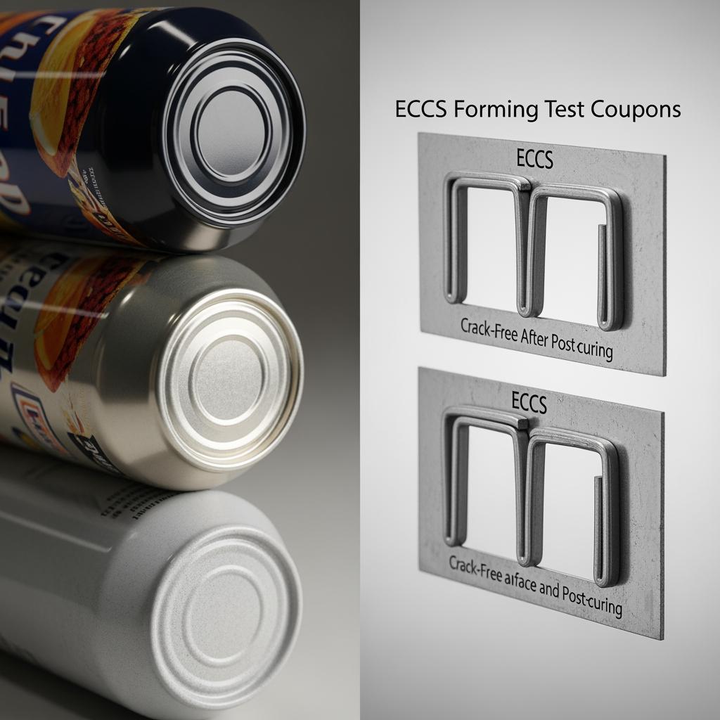 ECCS is a low-carbon steel sheet coated electrolytically with metallic chromium and a thin chromium oxide. Unlike tinplate, which uses a tin overlay, ECCS relies on its chromium oxide surface to anchor organic coatings. In food packaging, that difference shows up in process compatibility: ECCS excels where strong paint/lacquer adhesion and neutral taste are critical, while tinplate shines where solderability or natural tin corrosion resistance is desired for specific recipes.