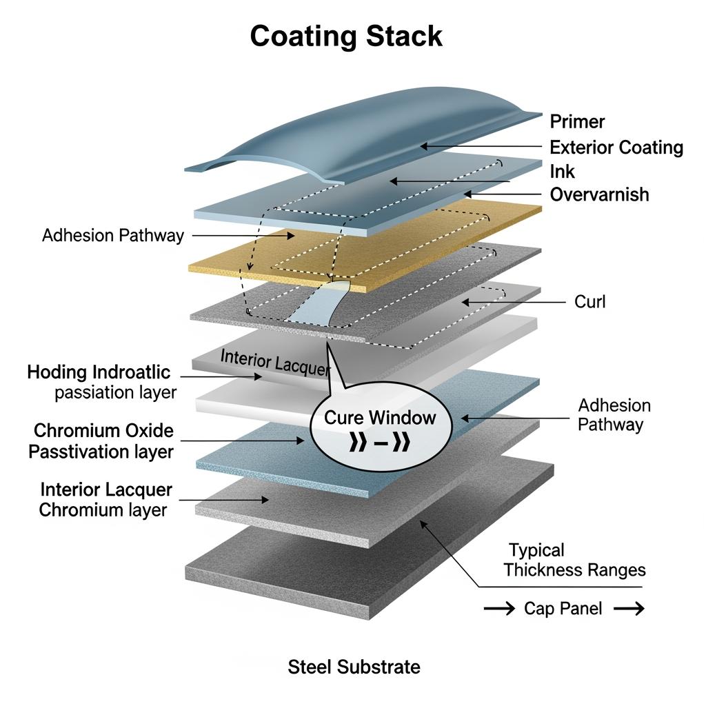 The chromium/chromium-oxide passivation anchors the lacquer, while the cured organic coating blocks acids and CO2. Good curl coverage and liner compatibility complete the system.