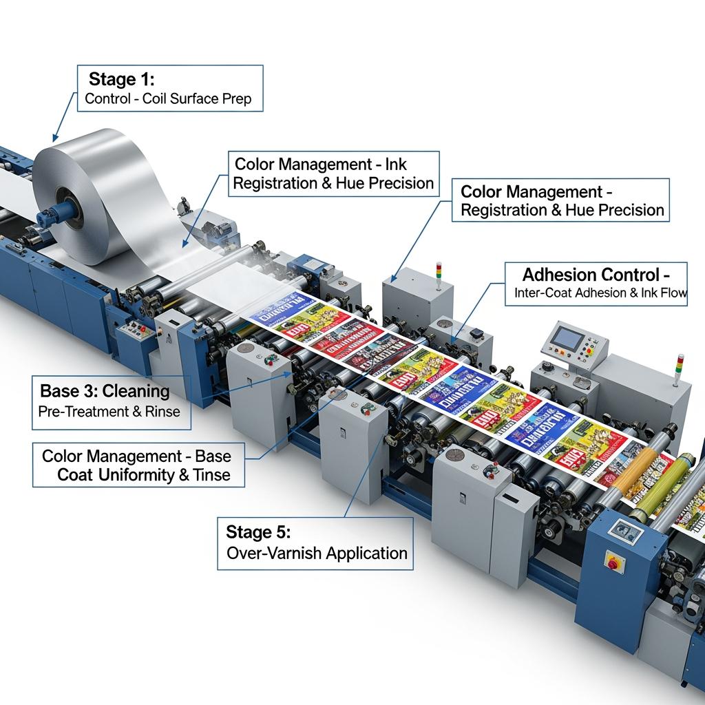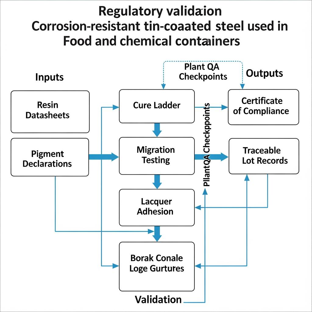 A practical approach is “action + check”: define recipe and process → select compliant lacquer system with supplier letter of guarantee → run lab cure ladder and migration testing (EU/US) → plant trial on production line → retain control samples for shelf-life verification. Keep records tied to coil ID and print lot—traceability is what turns good practice into auditable compliance.
