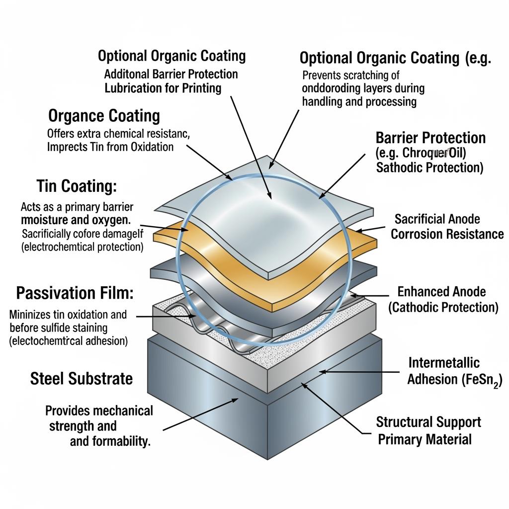 Beyond base steel, the overmetal and surface chemistry do the heavy lifting against corrosion. Tune tin coating weight to the environment, specify passivation to stabilize the surface, and add lubricants or lacquers that won’t interfere with paint materials.