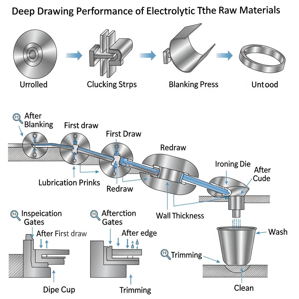 Double‑reduced tinplate is cold‑worked twice to elevate yield strength and reduce thickness while tightening gauge tolerance. In deep drawing and especially ironing, that higher yield helps resist wrinkling, keeps wall growth predictable, and stabilizes dome reversals during pressure tests. The trade‑off is reduced uniform elongation, so you must manage draw ratios carefully and rely on ironing to achieve height, not the first draw.