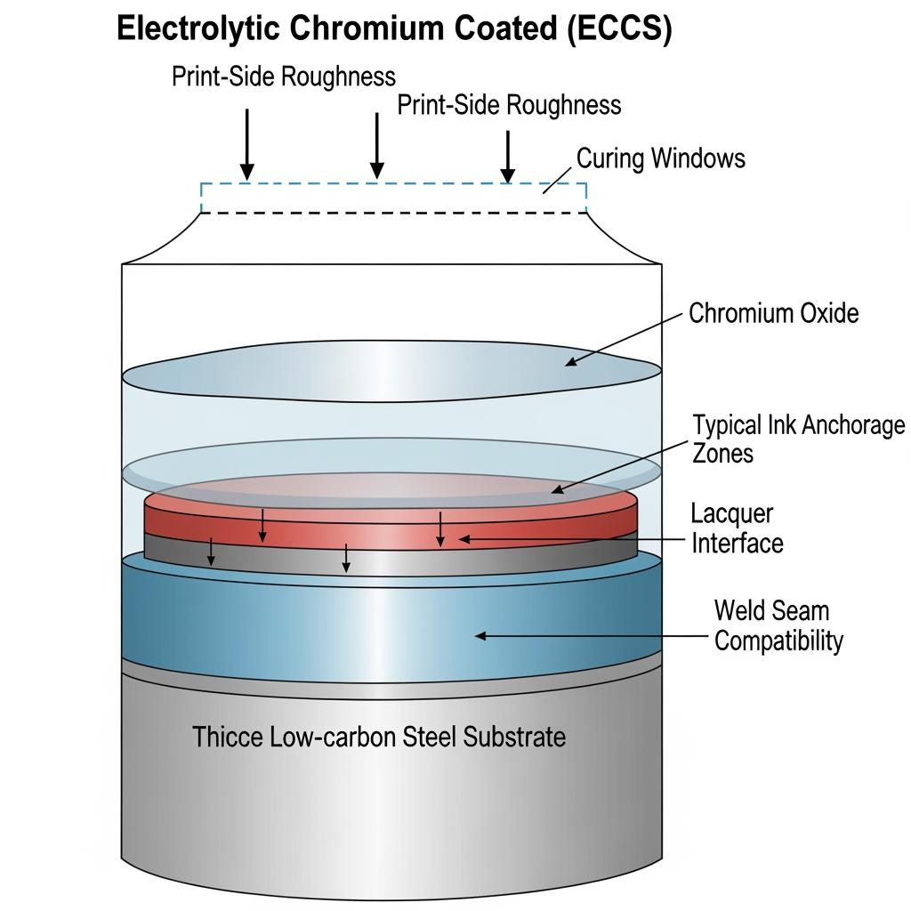 ECCS is low-carbon steel electrolytically coated with a thin metallic chromium layer and a chromium oxide layer. Unlike tinplate—which uses a tin coating providing sacrificial corrosion protection—ECCS relies on organic coatings for barrier performance and offers a harder, more inert surface for inks and varnishes. That surface neutrality is why ECCS is favored for fine halftones and dense solids.