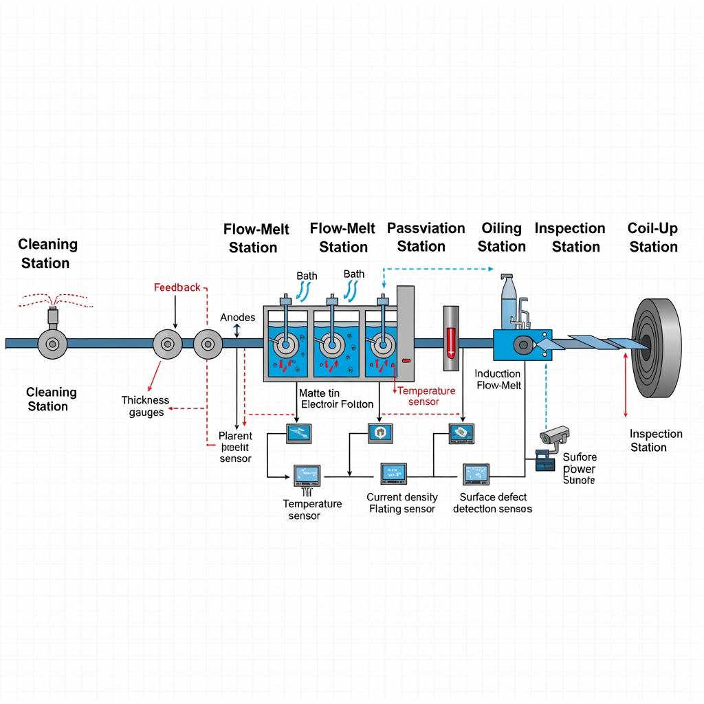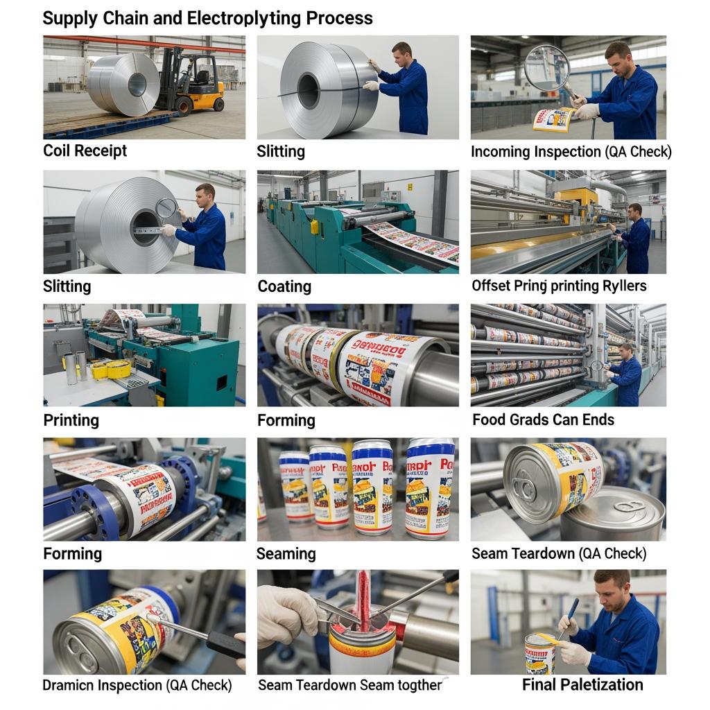 Production begins with cold‑reduced steel that is cleaned, annealed, and temper‑rolled to the specified hardness. The strip enters electrolytic cells where tin is precisely deposited, followed by flow‑melt to level the coating. Controlled passivation improves lacquer adhesion and corrosion resistance, and a light oiling supports downstream forming and printing. Throughout, inline gauges verify thickness, coating weight, and surface finish; off‑line tests confirm adhesion, porosity, and lacquer wetting.