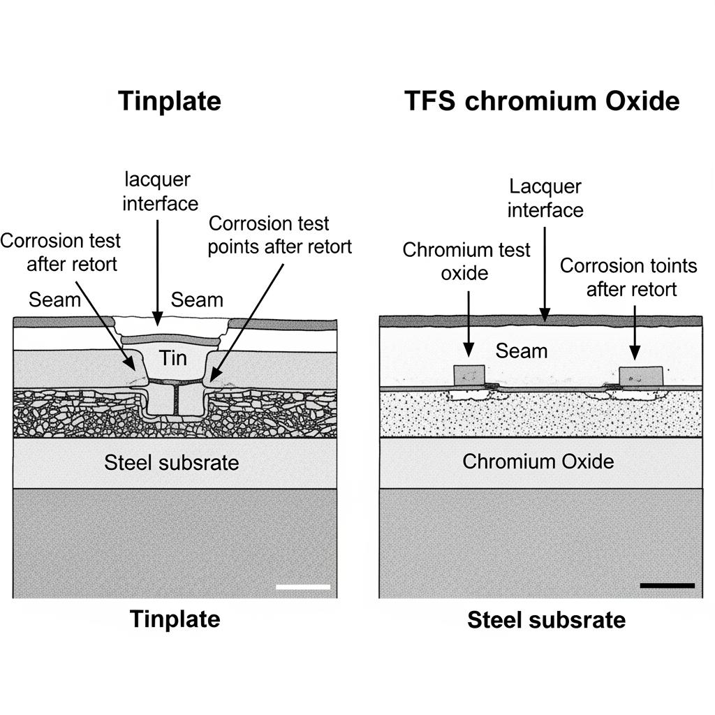 | Corrosion behavior | Intrinsic tin barrier plus lacquer; good for diverse foods | Relies on lacquer; strong for ends and tabstock |