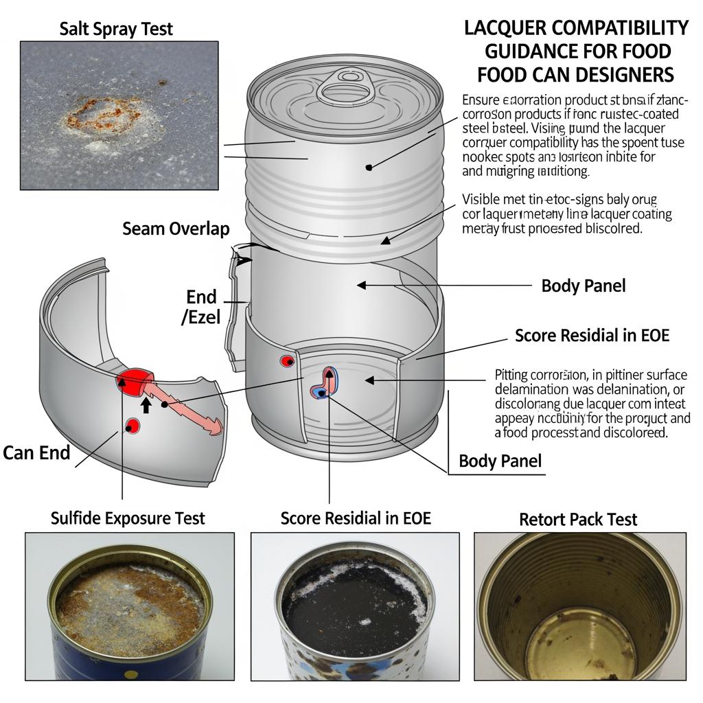 - Verify lacquer–food compatibility with retort simulation and 30/60/90‑day pack tests; inspect for blush, delamination, or sulfide staining.