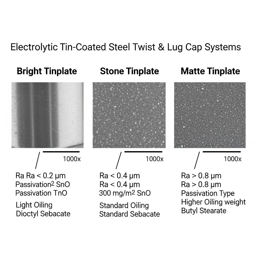 | Bright | Low | High gloss, sharp graphics | Low friction; needs careful stack handling | Premium decorative, high-shelf-impact caps | Supports Electrolytic Tin-Coated Steel for Twist and Lug Cap Systems branding with vivid inks. |