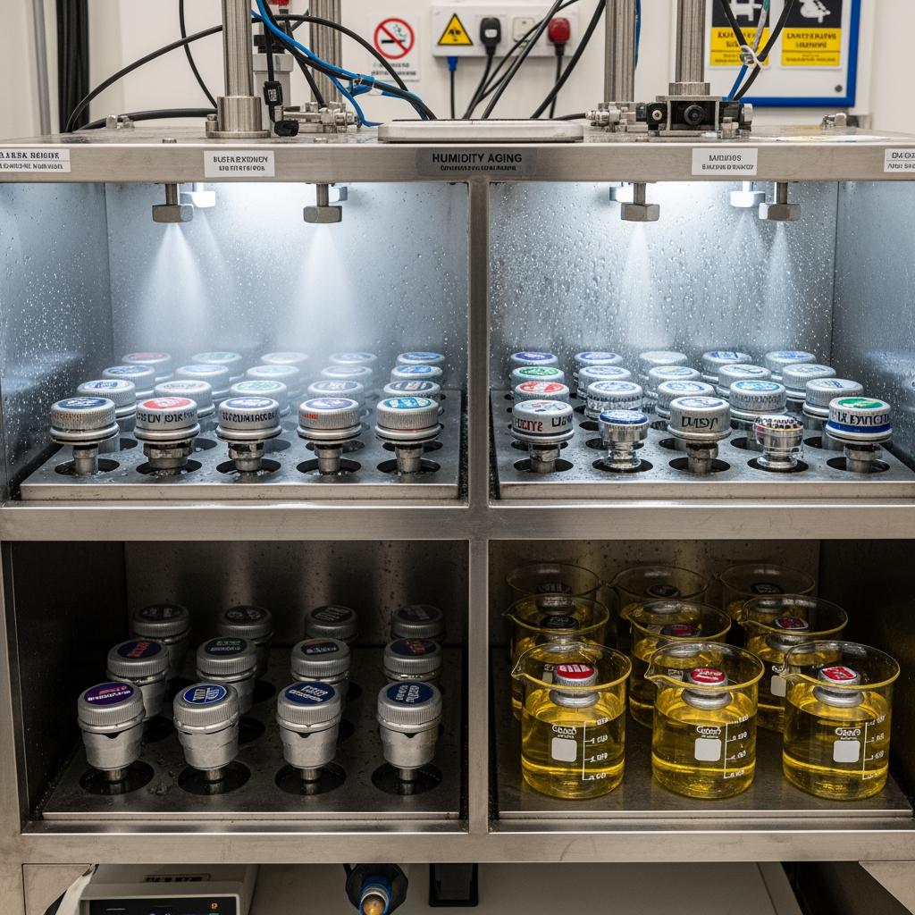 Combine salt spray, acidic media exposure, and pasteurization simulations with torque retention tracking. Always replicate sealing torque, headspace, and cool-down in your tests.