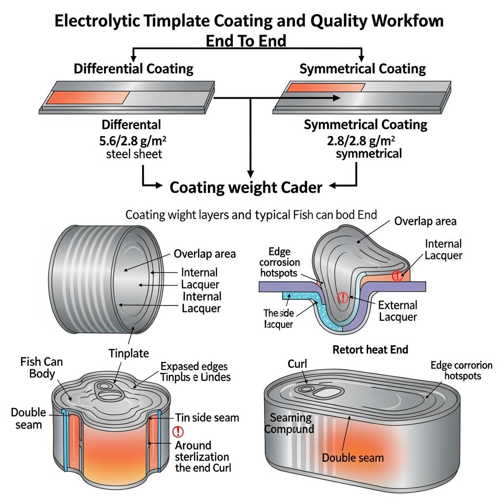 | Oily fish (sardine/mackerel) in oil, retorted | Single/double reduced, T2–T3 | Medium-to-heavy symmetrical coating | Aligns with Electrolytic Tinplate Grades for Fish Can Manufacturing best practice. |
