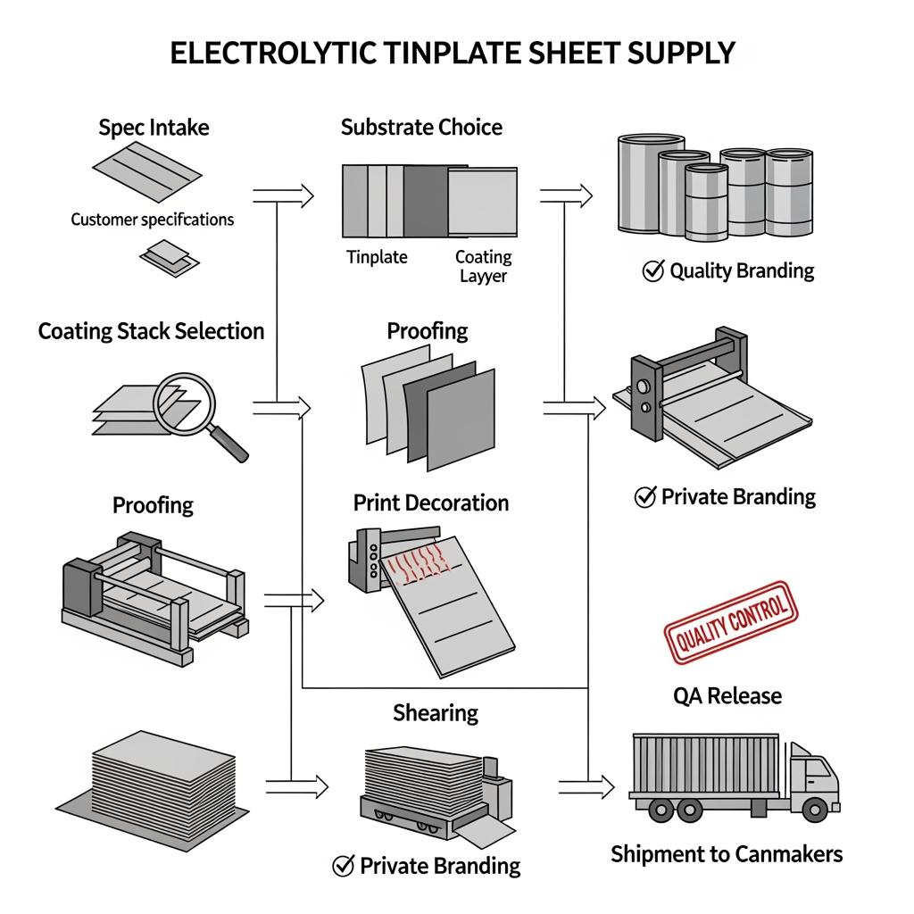 Private label ETP typically follows a structured flow: substrate selection (base steel grade and temper), electrolyte tin coating weight, chemical passivation and oiling, primer and topcoat stack, print decoration, and final shearing or slitting. Done right, brand owners keep flexibility on can formats while locking in brand color, fast curing, and scuff resistance from the start.