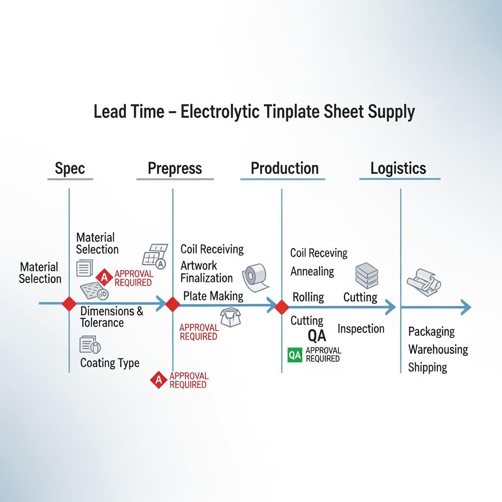 Lead time for private-branded ETP is driven by two clocks: substrate availability and artwork readiness. Substrate availability hinges on base steel planning and tinning capacity; artwork readiness depends on color targets, trapping, and press curve alignment. To keep projects reliable across seasons and promotions, plan forecasts in 12-week horizons and lock art early.