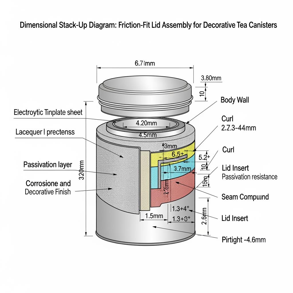| Interior lacquer | BPA-NI epoxy-phenolic / Acrylic / PET | Aroma neutrality and seam integrity for tea storage. |