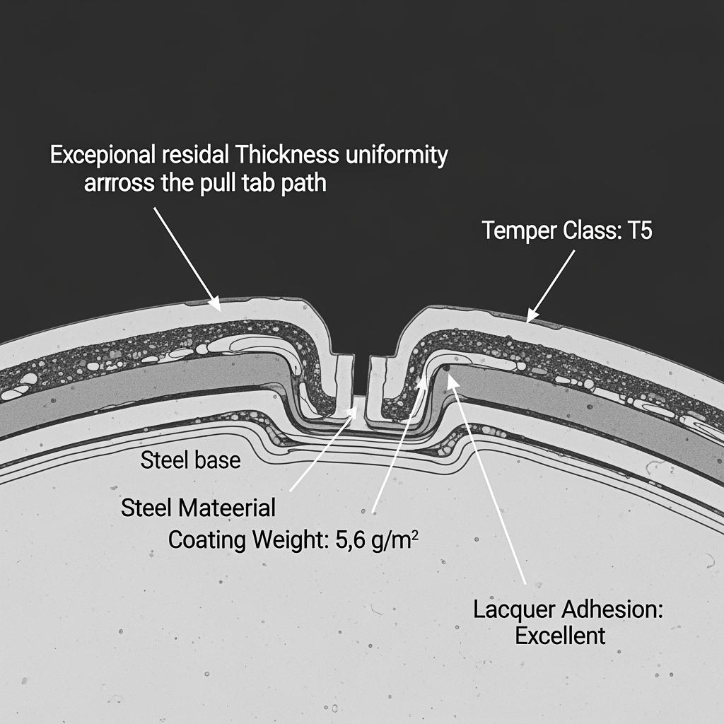 EOE lids need a base steel that can be deeply drawn for the panel emboss and tab rivet while still fracturing predictably along the score. This typically means “MR” or similar base composition with clean, low-inclusion steel, processed to the temper required by the diameter and opening force targets. For small diameters, higher temper helps maintain panel stiffness; for larger diameters, a slightly softer temper can provide a wider scoring window and reduce split risk around the rivet.