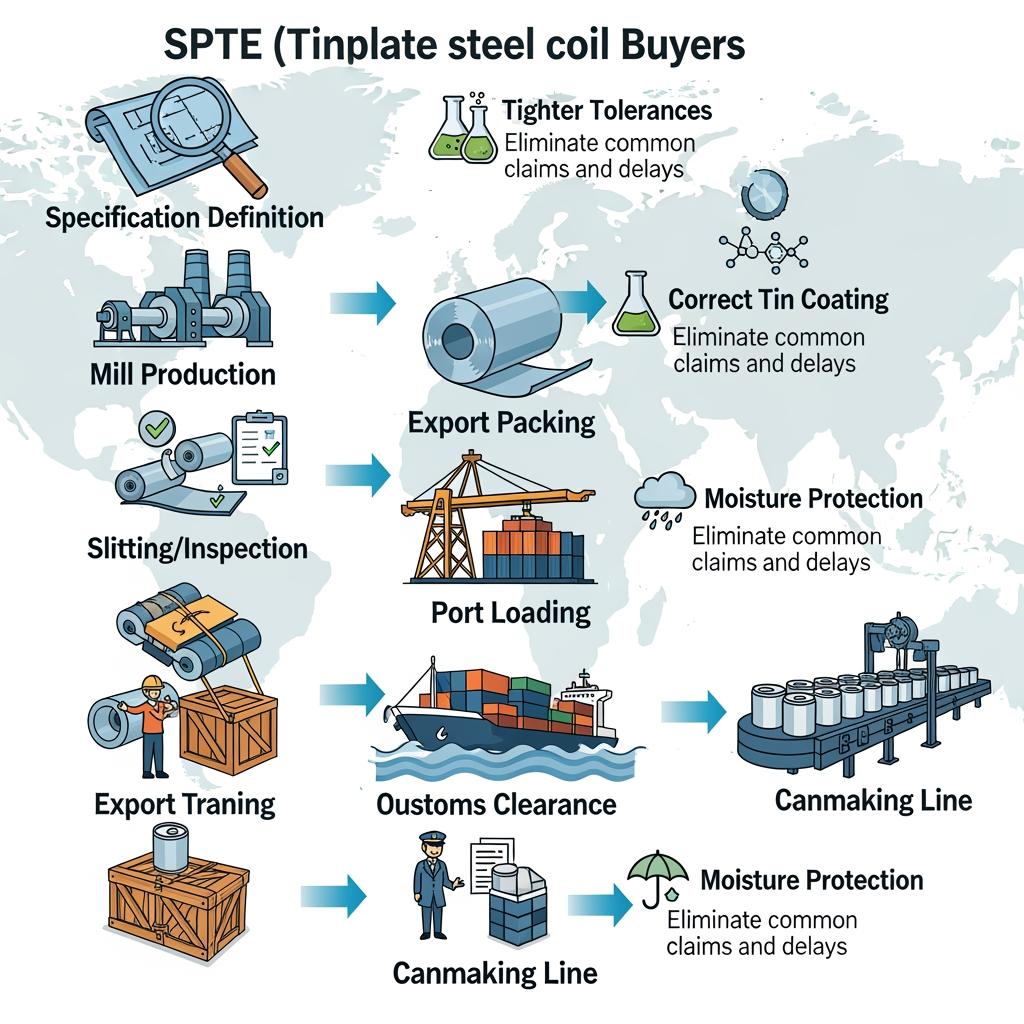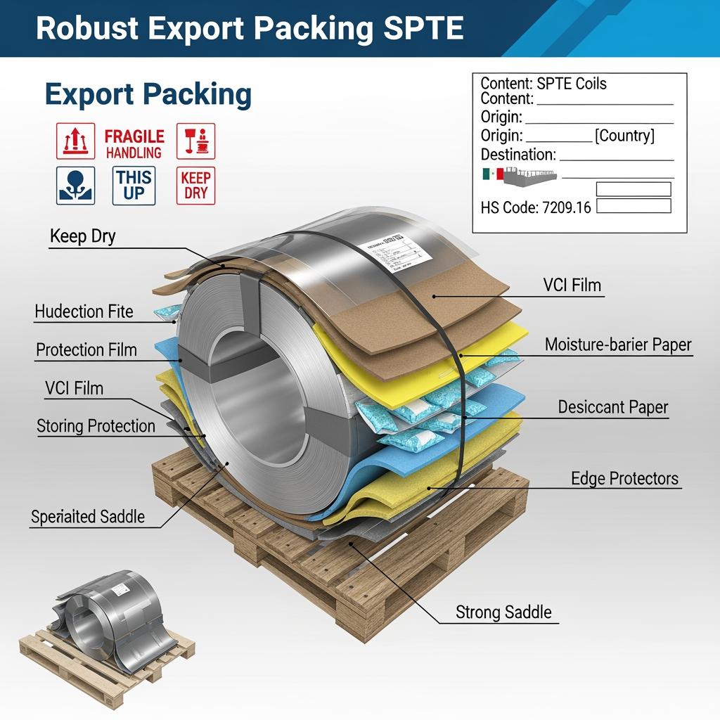 SPTE generally refers to electrolytic tinplate steel. In supply‑chain terms, it means managing coating mass, passivation, and finish so product and logistics risks are controlled end‑to‑end.
