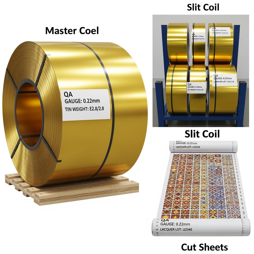 For color-critical golds, request two coil lots in qualification to test batch stability. When you’re ready to evaluate finishes or place trial POs, you can browse representative formats in the coated tinplate product catalog and align SKUs to your target gauges and widths.