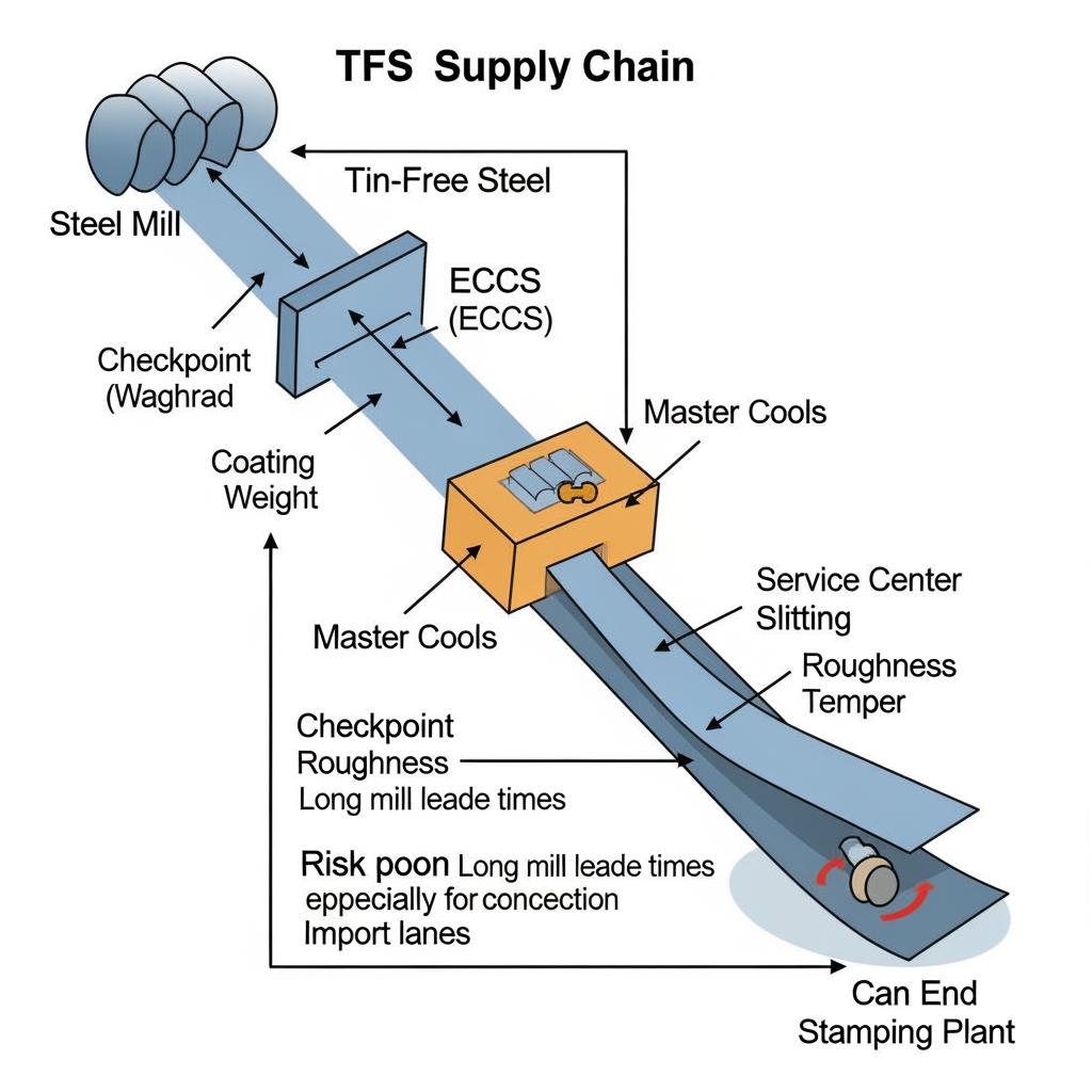 TFS sourcing typically involves mills for ECCS coating and regional service centers for slitting, passivation checks, and logistics. Lead time is driven by mill rolling schedules (often 6–12 weeks), shipping (2–6 weeks), and local slit-and-deliver cadence. Effective buyers lock quarterly forecasts, place split deliveries, and maintain safety stock sized to press-line cadence.