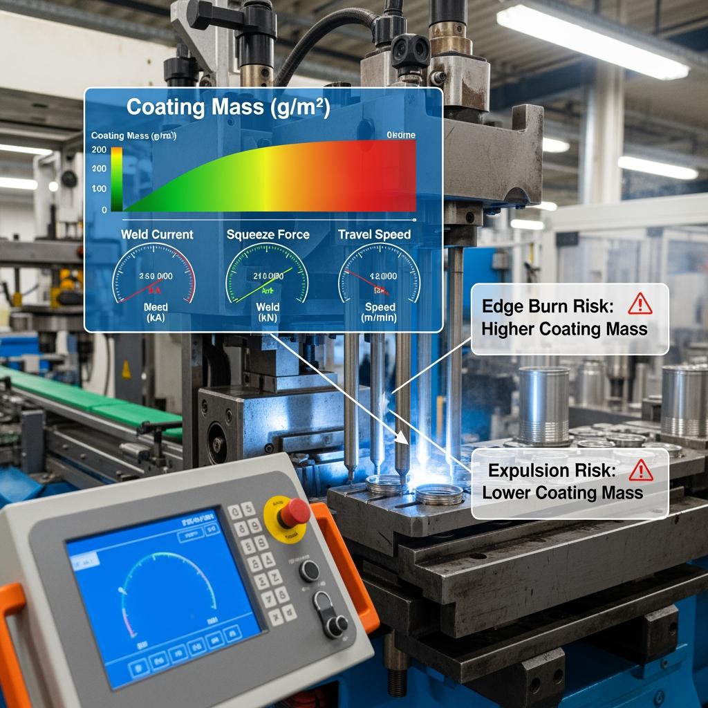 Lapisan yang lebih tinggi biasanya meningkatkan resistensi kontak, mempersempit jendela las. Rencanakan untuk memusatkan kembali arus, tekanan, dan kecepatan, serta verifikasi pembentukan nugget dan kinerja kebocoran.