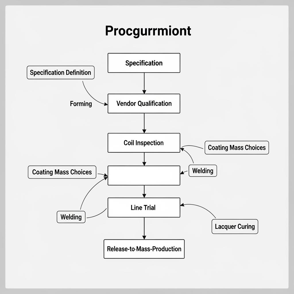 Perlakukan pengadaan sebagai program yang dikendalikan oleh teknik, bukan sebagai pembelian komoditas umum. Mulailah dengan membekukan spesifikasi teknis yang mencakup substrat, temper, ketebalan, massa pelapisan (dan orientasi untuk diferensial), pasivasi, peminyakan, dan metode pengujian yang diperlukan. Selaraskan kriteria penerimaan: toleransi pelapisan per sisi, permukaan akhir, dan ambang batas cacat yang relevan dengan proses penarikan/pengelasan Anda. Kemudian petakan inspeksi koil masuk dengan alur “tindakan → periksa” sederhana: terima koil → verifikasi tag/spesifikasi → ambil sampel kedua sisi → konfirmasikan kecocokan pasif dengan penarikan pernis → jalankan uji coba jalur pendek.
