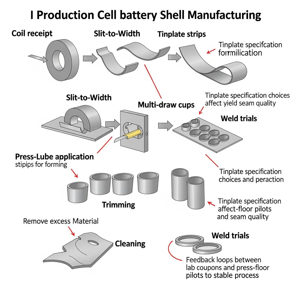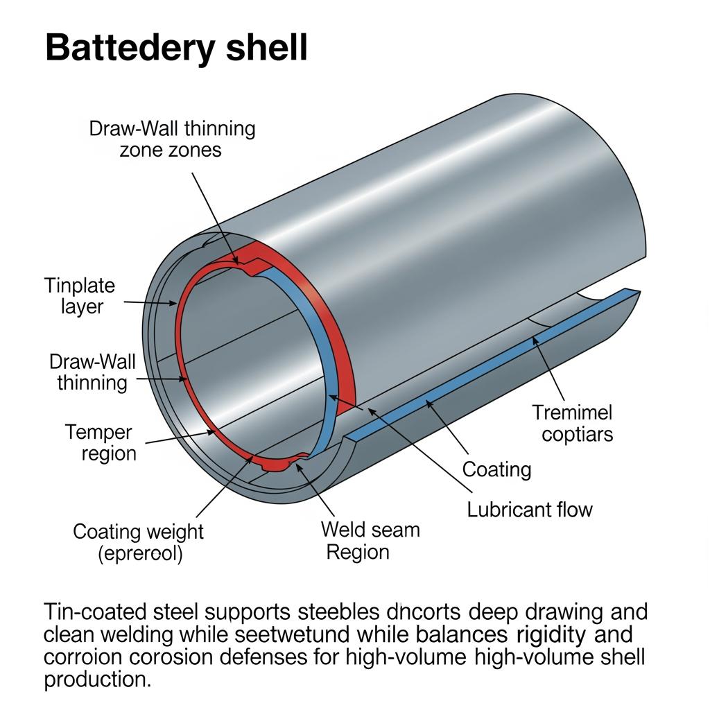 Raw tinplate—low-carbon steel coated with a thin tin layer—offers a rare mix of deep-draw formability, resistance to electrolyte-induced corrosion, and resistance-weld compatibility for seam or cap joints. Unlike bare steel, the tin layer stabilizes the surface during forming, helps protect trimmed edges, and supports post-forming processes like spot welding and laser sealing with minimal contamination when correctly degreased.