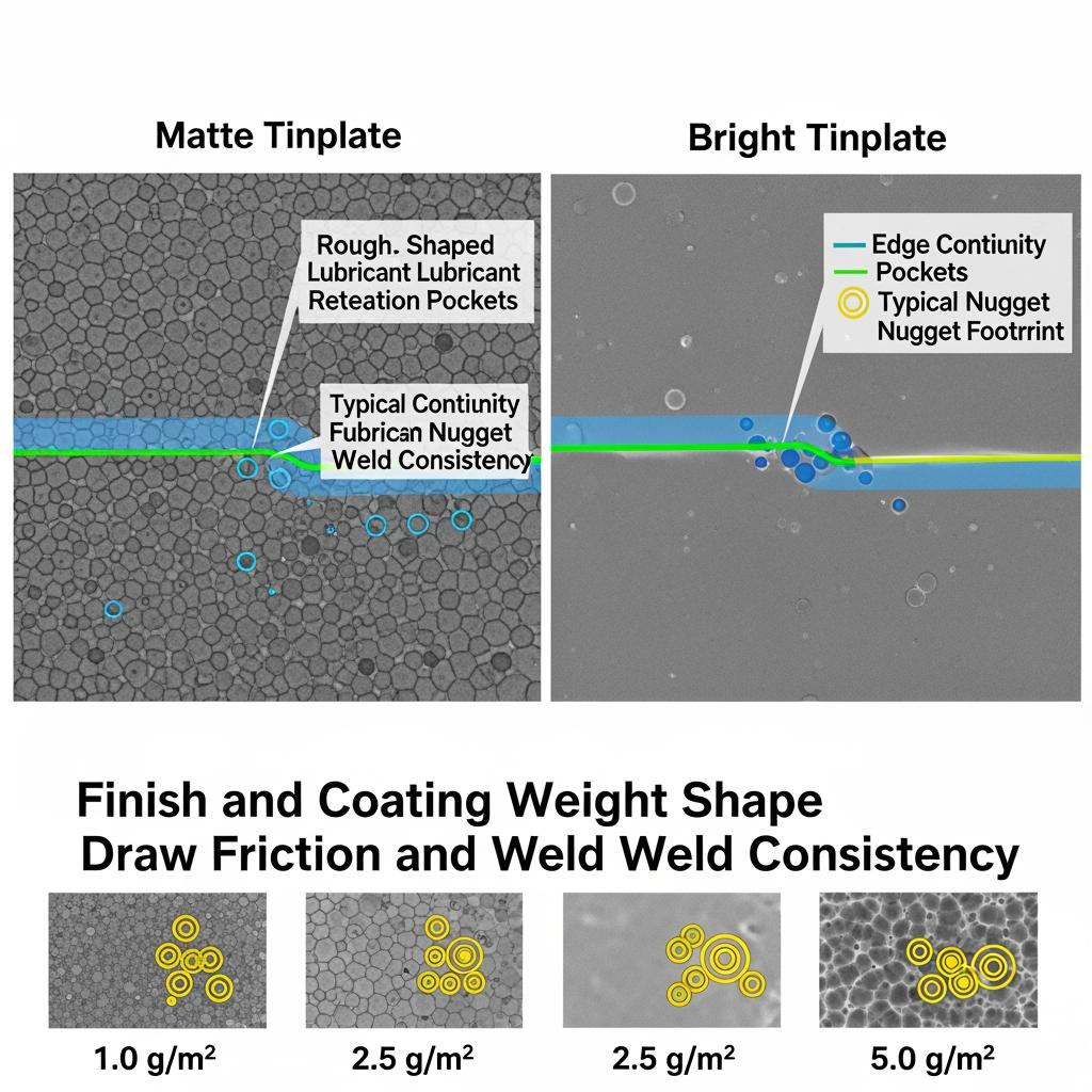 Two practical controls reduce surprises: specify roughness (Ra) compatible with your press lube so the film stays put during the first draw, and write an acceptance band for tin-layer continuity on cut edges to avoid early-edge staining.