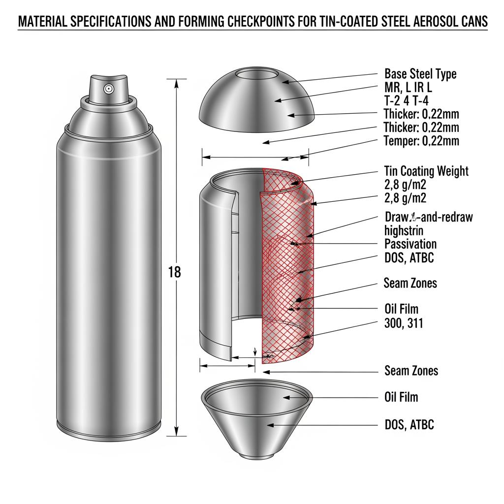 Aerosol cans typically use low-carbon steel substrates engineered for deep draw and redraw. Common base families include MR and L grades for general to food-contact performance, and DR (double-reduced) for higher strength at lower gauge. Selecting the substrate is a balance among drawability, panel strength, dome strength, buckle resistance, and weight.