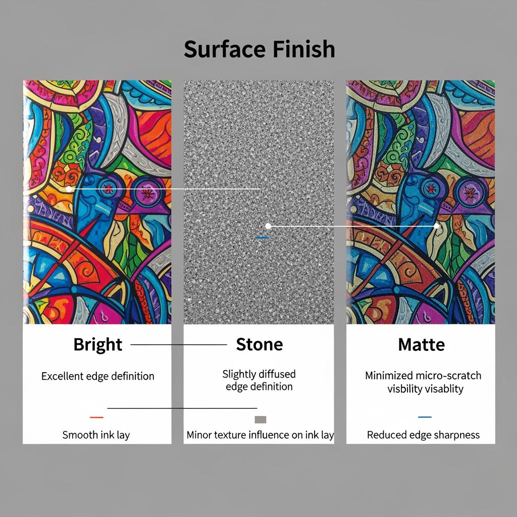 Bright suits high-gloss branding; stone or matte help with lacquer anchorage and scratch masking. Decide via print-and-bake trials using your exact ink and oven curve.
