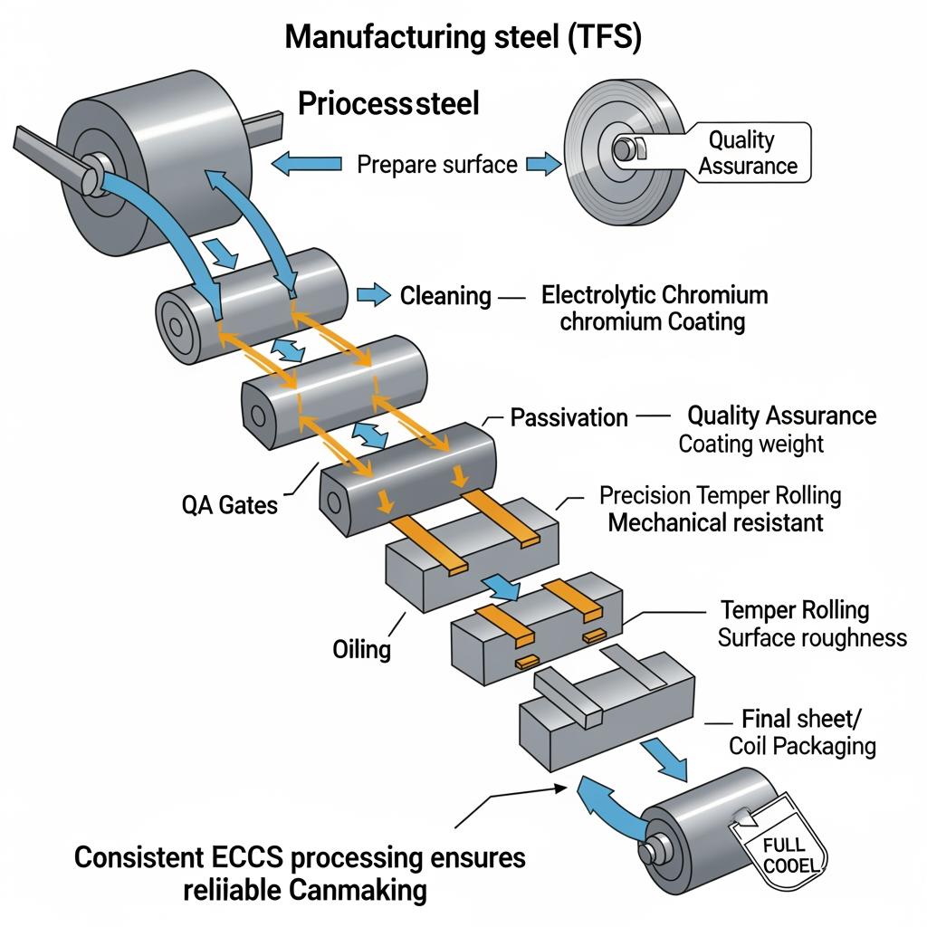 ECCS starts with high-quality, cold-rolled low-carbon steel. The coil is cleaned, then passed through an electrolytic bath where a very thin metallic chromium layer is deposited, followed by a controlled oxidation step that forms a stable chromium oxide film. This duplex layer improves lacquer anchorage and corrosion behavior while avoiding the use of elemental tin. After passivation, temper rolling tunes mechanical properties, and a light oil preserves surface integrity for forming and printing.