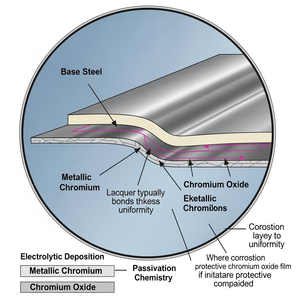 ECCS has a steel substrate, a thin metallic chromium layer, and a chromium oxide film. This surface welcomes lacquer, enabling safe food-contact systems when correctly specified.