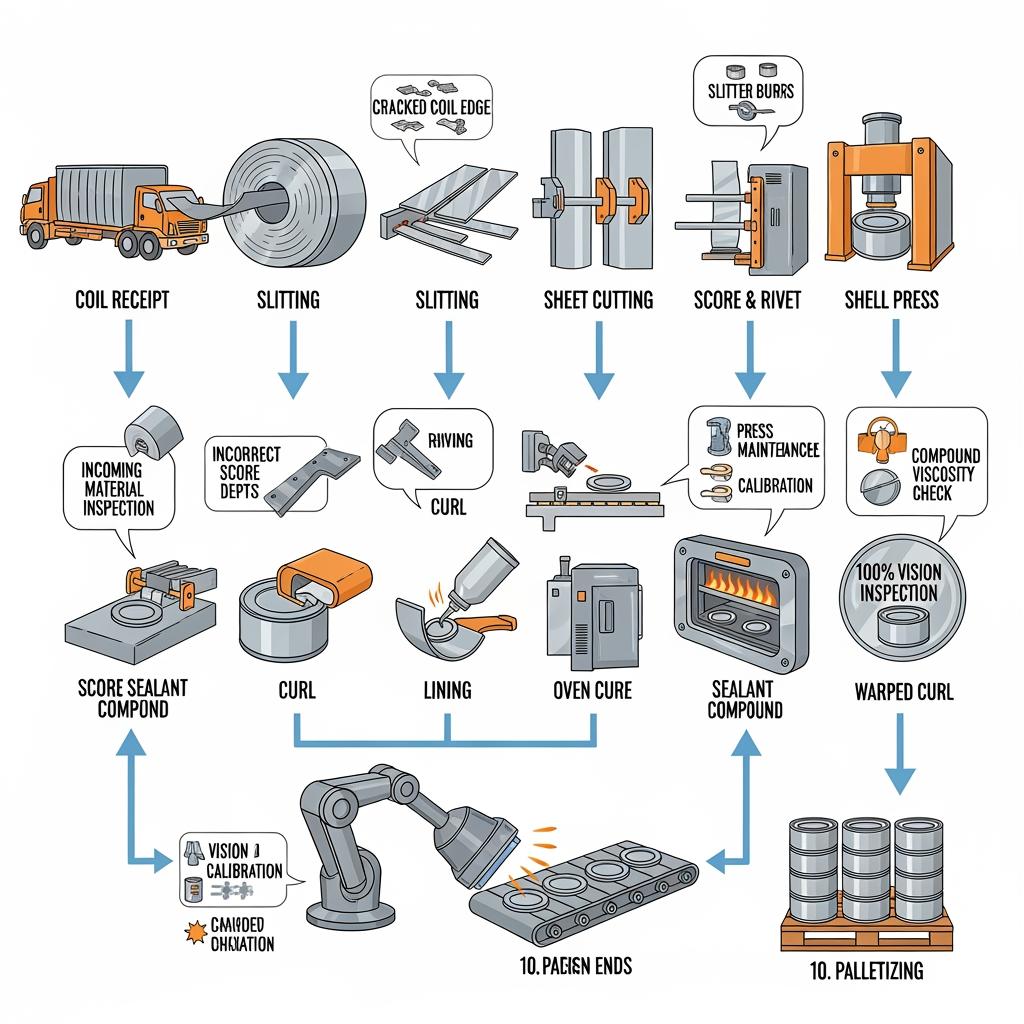 Tinplate reaches end plants as master coils or slit coils, then may be leveled and cut into sheets if the pressroom runs on sheets. In production, blanks are pressed into shells, rivets are formed, end panels are coined, and score lines are created to a depth tolerance that can be a fraction of microns. Curling, lining with compound, and thermal curing follow, with 100% vision checks for score continuity, rivet height, and curl integrity. The right sheet cleanliness and flatness minimize misfeeds and protect score uniformity, which directly impacts openability and double-seam integrity downstream.