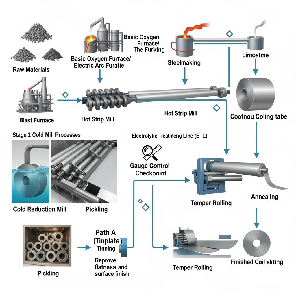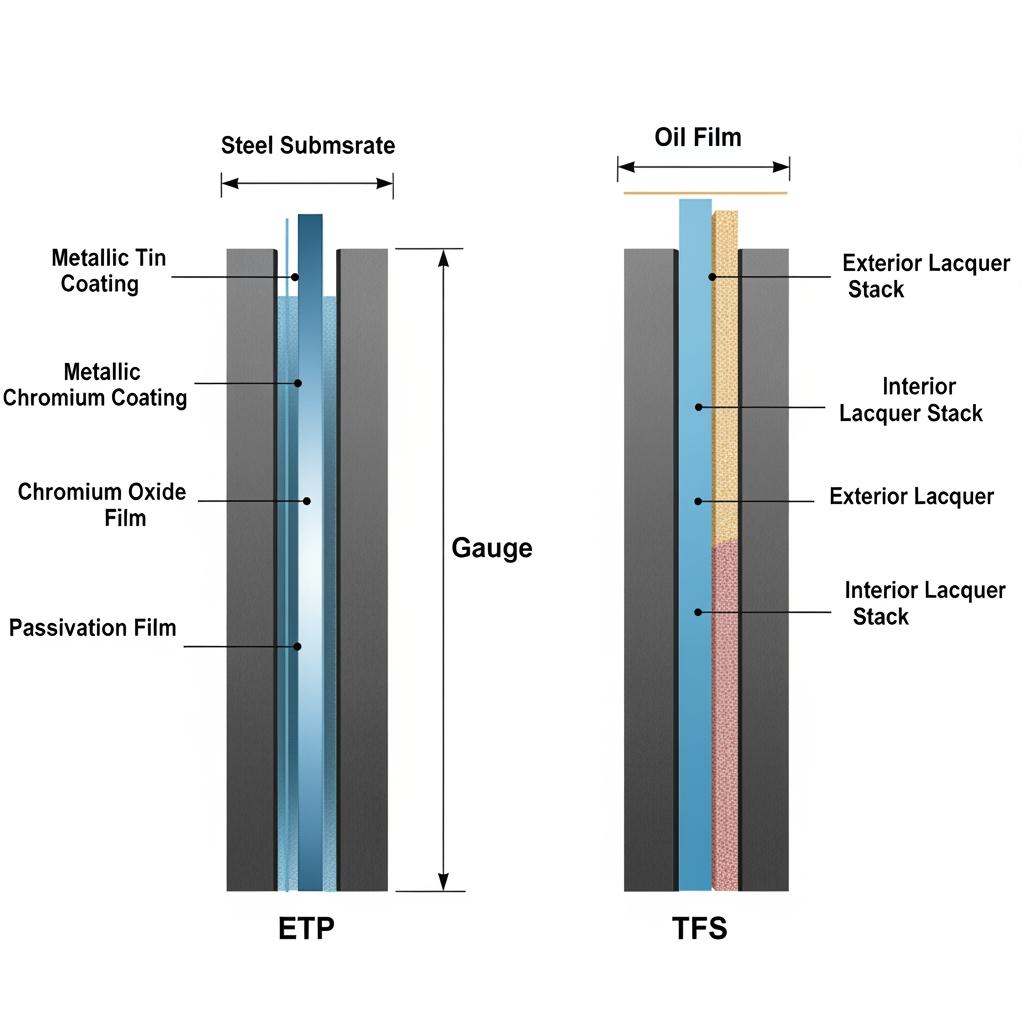 Cold‑reduced low‑carbon steel is the substrate, coated with either electrolytic tin (ETP) or chromium/chromium oxide (TFS), plus passivation, oiling, and food‑grade lacquers/inks.