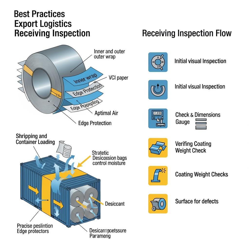 Mill test certificates, coating weight distributions, passivation details, lacquer declarations, and coil ID traceability enable smooth receiving and quality control.