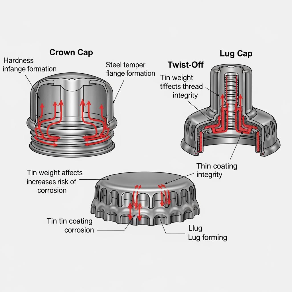 Different caps stress steel in different ways. Crowns need uniform panel strength and consistent crimp; twist-offs demand smooth thread formation and torque stability; lug caps must draw deeply without edge splits while keeping strong bridges.