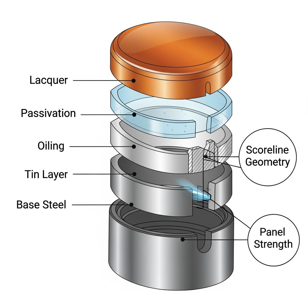 Thickness and temper set base strength, while tin weight and lacquer influence friction and corrosion resistance around the score. Optimize them together to hit your tear-force window.