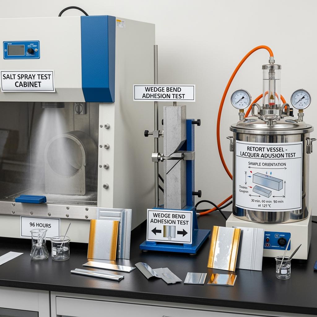 A practical EO test plan might include salt spray exposure for outside-face protection, sulfur staining or sulfide resistance checks for protein-rich foods, and wedge-bend or reverse impact to confirm lacquer integrity over scorelines. Pilot packs should simulate worst-case storage humidity and temperature to confirm rivet and curl edges remain protected.