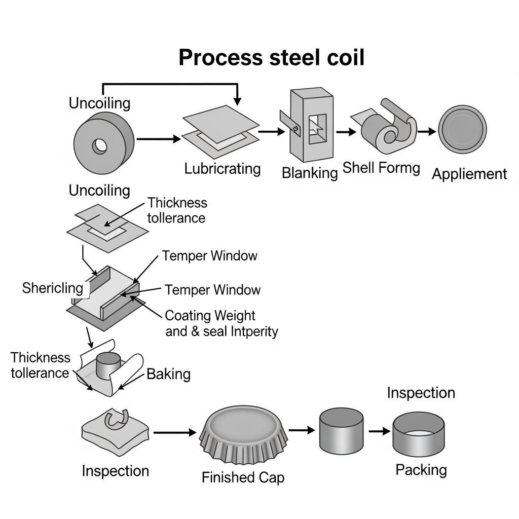 A crown cap’s nine lives are lived in milliseconds: blanking, shell draw, curl, lining, and bake. Coil choice touches each step. Too soft, and curls slump; too hard, and splits appear at the button radius. Too little tin, and corrosion undermines graphics during distribution.
