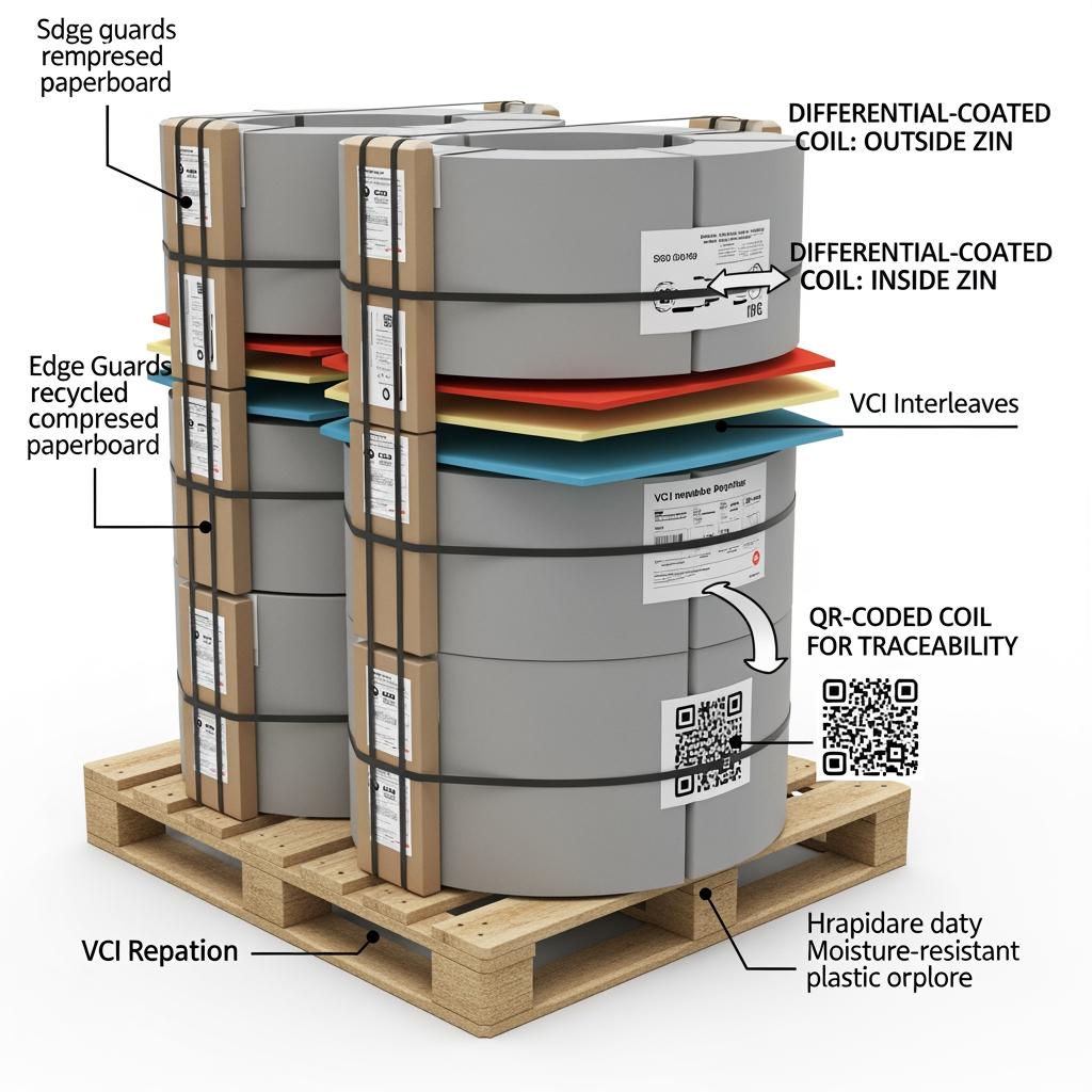 Specify dry, seaworthy packing with VCI, edge guards, and moisture indicators, plus clear orientation labels for differential-coated coils to avoid assembly errors.