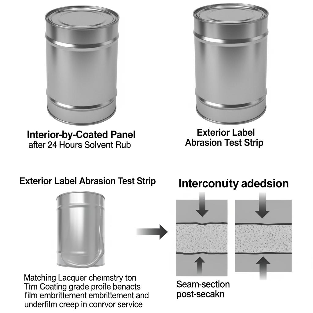 Request coated panels, run your actual bake curve and seam settings, and hold filled cans for a short conditioning period to check for staining or film issues.