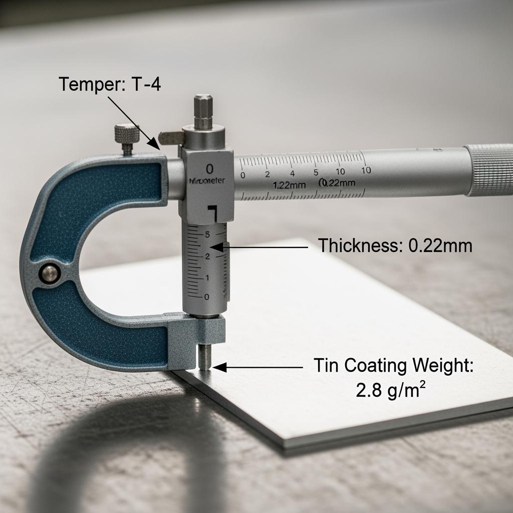 | Tin coating weight (per side) | ~2.8, 5.6, 8.4 g/m² | Higher coatings for corrosive fills or long shelf-life | Balance corrosion margin vs. solderability and cost. |