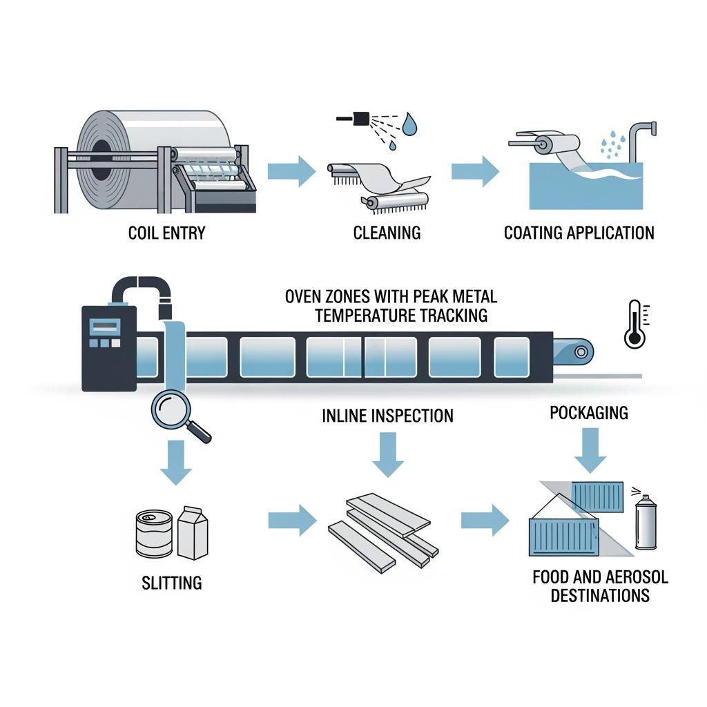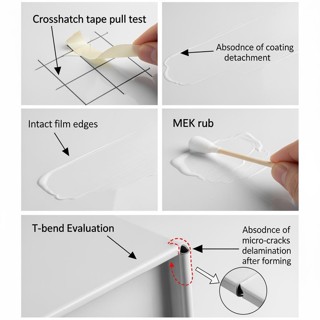 • Sample QC plan: Receive coil with COA → cut witness panels per coil ID → bake confirmation panels to your target PMT profile → run crosshatch, MEK rub, and cup draw tests → archive retains and record oven curves for traceability.